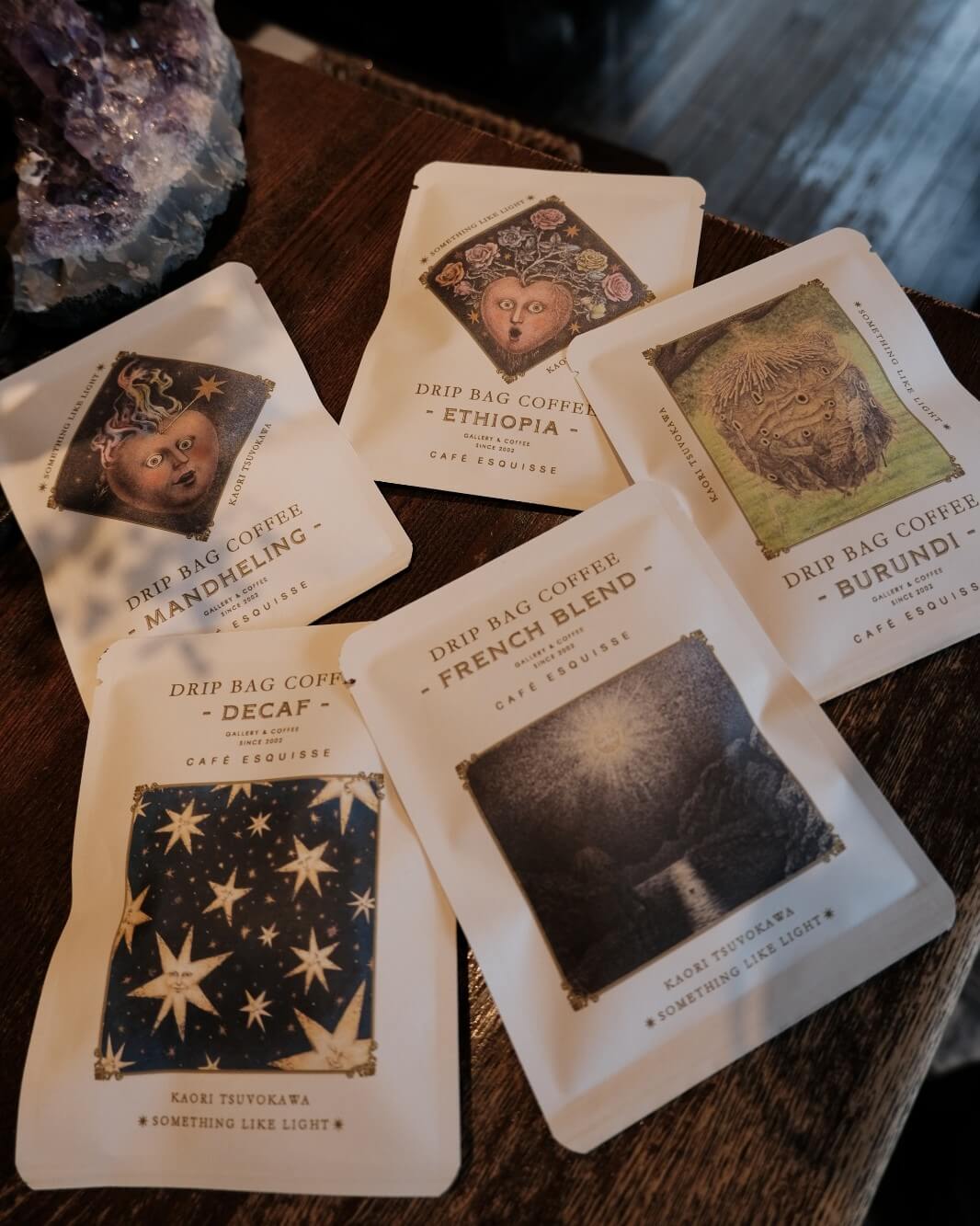 以前からあたためていた展示作品とのコラボ企画、第一弾はツボカワカオリさんの作品を豆の銘柄5種のイメージに合わせてご用意させて頂きました。中身で選んでも、お好きな作品の絵柄で選んでも、お楽しみ頂けます。丹精込めて焙煎した珈琲を素敵な作品と合わせて、ご自宅やオフィスでどうぞ。数量限定、無くなり次第終了です。
