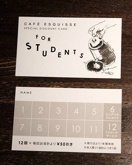学生の方も気軽にご利用いただけるよう、毎回合計金額より50円引きになる学割スタンプカードを発行しています。スタンプが貯まると特典もありますので、カード発行希望の学生さんはお気軽にお声をかけて下さい!